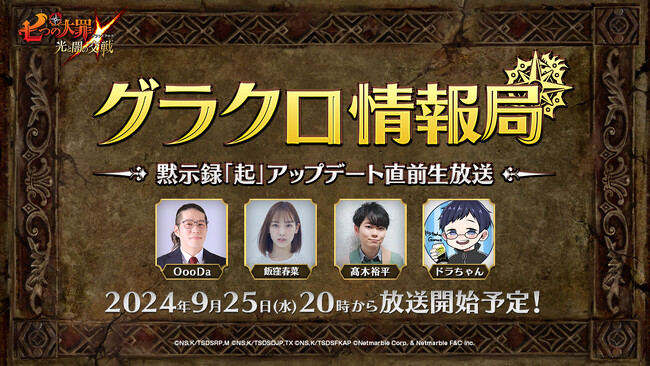 ネットマーブルは、 スマートフォン向けシネマティックアドベンチャーRPG『七つの大罪 ~光と闇の交戦(ひかりとやみのグランドクロス)~』(略称:グラクロ)の公式WEB番組「第60回グラクロ情報局~黙示録の四騎士「起」アップデート直前生放送~」を、9月25日(水)20:00より、生放送することをお知らせいたします。
