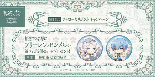 株式会社サイバード(本社:東京都渋谷区、代表取締役社長 兼 CEO 長嶋 貴之、以下「サイバード」)は、TVアニメ『葬送のフリーレン』の限定グッズを受注販売する「葬送のフリーレンクイズ ONLINE STORE」を、2024年9月25日(水)から11月13日(水)まで開催します。