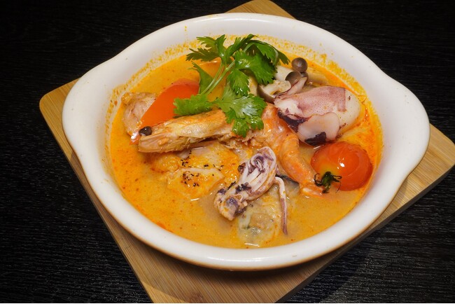 ●「トムヤムスープ」:エビ以外に、鶏肉、イカ、きのこなどが入った具だくさんのスープで、辛さを控えめに仕上げています。プリっとした食感とさまざまな旨みが感じられる一品は、タイ出身のスタッフに監修してもらいました。パクチーが苦手な方はネギにご変更できます。