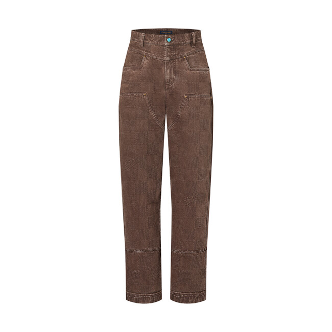 2024秋冬ファッションショーで発表されたウエスタンワークウェアの一部として登場した今すぐ活躍するデニムパンツ。「Marque L.Vuitton deposee」シグネチャーを織り込んだダミエ・ジャカード キャンバスに、着用感を演出するウォッシュ加工を施してアップデートしました。ターコイズ風のボタンがダンディなひねりをプラス。