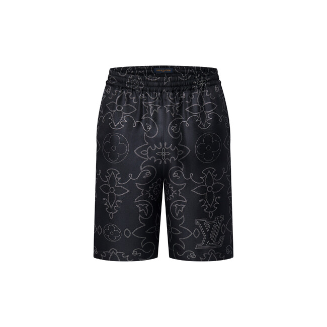 シルク100%で仕立てたプリントショーツ。LV アラベスク・モチーフは、カウボーイブーツの装飾から着想を得てモノグラムにロマンティックなひねりを加えたもの。ホワイト & ブラックのグラフィカルなプリントがリアルなステッチのような遊び心溢れる表情を演出します。同シリーズのシャツと合わせればリラックス感がありながらもシックなスタイルに。デイタイムからイブニングシーンまで活躍するエレガントな1着です。