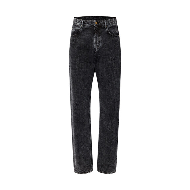 2024秋冬ファッションショーに登場したブラックのデニムパンツ。ストレートレッグのワークウェアシルエットに仕上げました。「Marque L.Vuitton deposee」シグネチャーを織り込んだダミエ・ジャカード キャンバスでラグジュアリーな雰囲気を添え、しなやかさと着古した風合いを演出するウォッシュ加工を施しました。背面に配したダミエ・ヌバック ジャクロンが多用途に楽しめるアイテムを引き立てます。同シリーズのジャケットと合わせれば、ランウェイさながらのルックに。