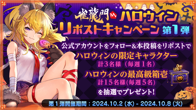 新イベント「ハッピーハロウィン!麻雀しないと食べちゃうぞ~」の開催を記念して、「ハロウィンリポストキャンペーン」を開催します。雀龍門MのX公式アカウントから投稿される当キャンペーンのポストをリポストして頂いた方の中から抽選でゲームアイテムをプレゼントします。