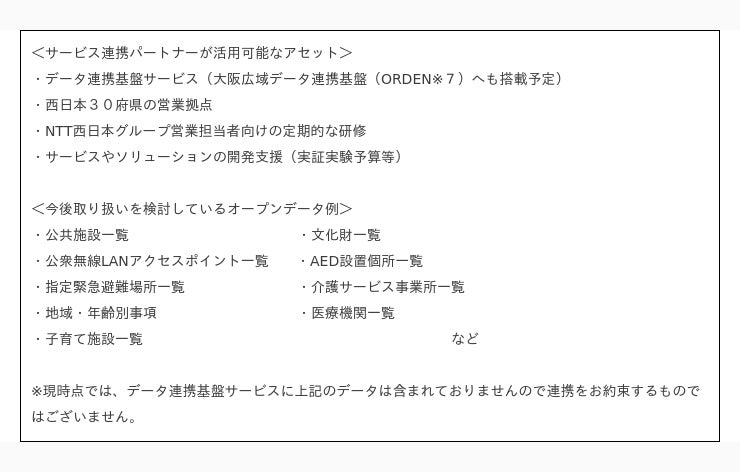 西日本電信電話株式会社(代表取締役社長:北村亮太、以下、NTT西日本)は、NTTビジネスソリューションズ株式会社(代表取締役社長:北山泰三、以下、NTTBS)が2024年10月2日より提供しているデータ連携基盤サービス※1をNTT西日本グループのアセットとして提供し、「自治体や事業者、個人等が保有するデータの利活用」や「地域の課題解決に資するサービスの実現」により、便利で快適に働ける・安心して豊かに暮らせる社会の実現にともに取り組むサービス連携パートナーを募集します。