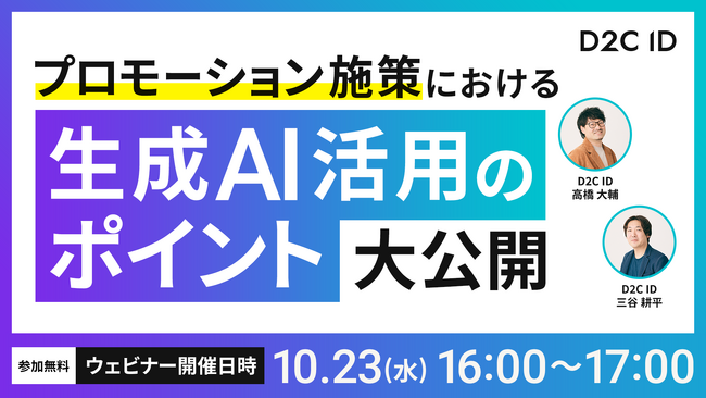 株式会社D2C ID(本社:東京都港区、代表取締役:岡 勇基、以下D2C ID)は、企業のマーケティング・コミュニケーション領域において活用事例が増えている「生成AI」について、プロモーション施策における生成AI活用のポイントを解説する無料ウェビナーを、2024年10月23日(水)に開催いたします。