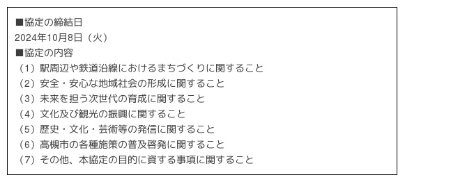 当社グループでは、本協定の締結により、高槻市とこれまで以上に緊密に連携・協力し合いながら、引き続き沿線の価値向上やSDGsがめざす持続可能な社会の実現に向けて取り組んでまいります。