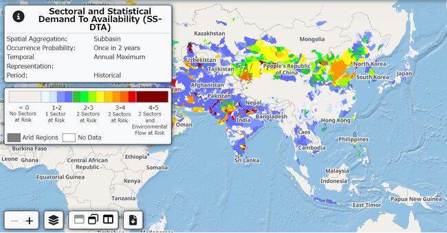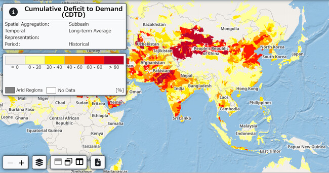 指標(a)Cumulative Deficit to Demand(CDTD)。指標(b)Sectorial and Statistical Demand To Availability(SS-DTA)。指標(a)を使うと、実際に水不足が生じる可能性が高い地域を特定することが出来る。さらに指標(b)を使うと、農業用水、工業用水、生活用水、川などに棲む生き物が必要とする水のうち、どの用途の水が不足する可能性が高いかが分かる。青色が農業用水、緑から黄色が農業・工業用水、オレンジから赤色が農業・工業・生活用水が不足する可能性が高いエリアを示す。茶色は全ての用途で水が不足し、生き物が必要とする水も不足する可能性が高いエリアを示す。