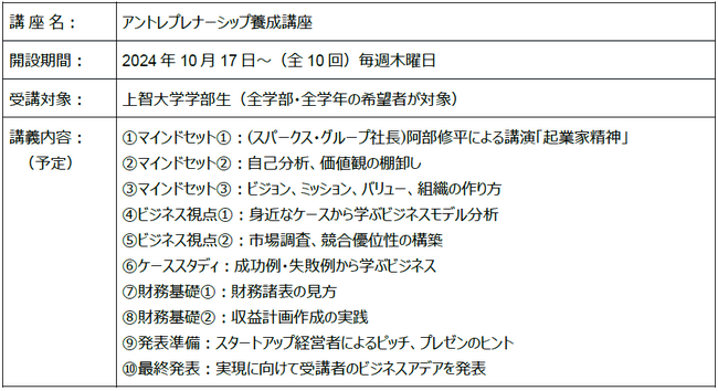 スパークス・グループ株式会社は、上智大学(東京都千代田区、学長:曄道佳明)にて「(第2回)アントレプレナーシップ養成講座」を2024年10月17日(木)より開講いたします。