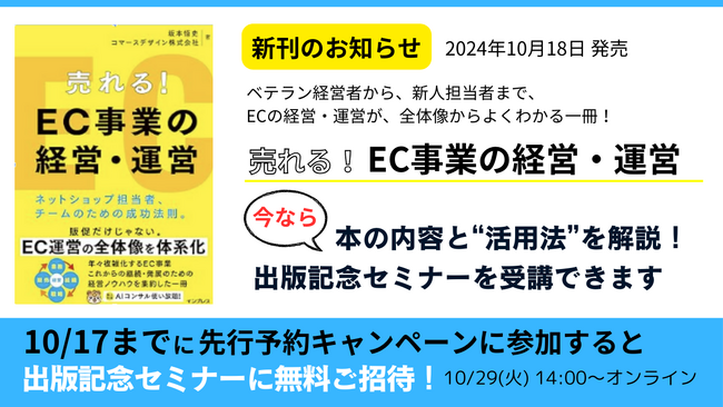 コマースデザイン株式会社(所在地:東京都渋谷区、代表取締役:坂本悟史)は、2024年10月18日(金)に、弊社の新著である「売れる!EC事業の経営・運営」(インプレス)を出版いたします。