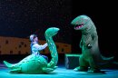 今回の公演は、『おまえ うまそうだな』と『きみはほんとうにステキだね』の2本のおはなしを上演。絵本の絵柄をそのまま立体化した、愛らしい恐竜たちがステージに登場し、暖かな世界観を作り上げる。物語の途中で歌が入ったり、映像を使ったりと、子どもたちも飽きずに楽しめる工夫も満載だ。物語と物語の間には、観客が好きな恐竜を答えるコーナーや一緒に参加できるクイズも。子どもたちの笑顔が弾ける時間となっている。