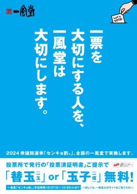 株式会社力の源ホールディングス(本社:福岡市中央区、代表取締役社長:山根 智之)傘下の「力の源カンパニー」が運営する、博多発祥の世界に展開するラーメン店「一風堂」は、2024年10月27日(日)に投開票される「第50回衆議院議員総選挙」に合わせ、10月27日(日)~10月29日(火)の3日間、国内の営業中の「一風堂」および「一風堂KAY」、フードコート業態店の「IPPUDO RAMEN EXPRESS」「RAMEN EXPRESS 博多一風堂」全店において「センキョ割」を実施します。期間中、店舗にてラーメンをご注文のうえ「投票済証明書」をご提示いただいたお客様を対象に、「替玉一玉」もしくは「半熟玉子一個」のいずれかを無料でご提供いたします。当特典は、3日間何度でもご利用いただけます。
