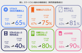 端末価格が上昇する一方で、スマートフォンの機能もそれに見合った進化を遂げている。各機能の販売数量構成比をまとめた(図1)。2年前と比較して、高画素カメラを搭載する端末が増えて、きめ細やかな写真撮影を可能にしている他、有機ELディスプレイや、6インチ以上の大画面、リフレッシュレート90Hz以上といった、より動画やゲームを楽しめる端末も伸長した。大量の写真や動画を保存するための内蔵ストレージにおいても大容量化の傾向が見られた。物理的なSIMカードが不要なeSIMに対応する端末も既に9割に達した。