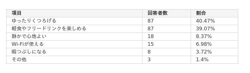 - 空港ラウンジのメリットとして「ゆったりくつろげる」「軽食やフリードリンクを楽しめる」と答えた人が多く、それぞれ全体の約4割を占める。