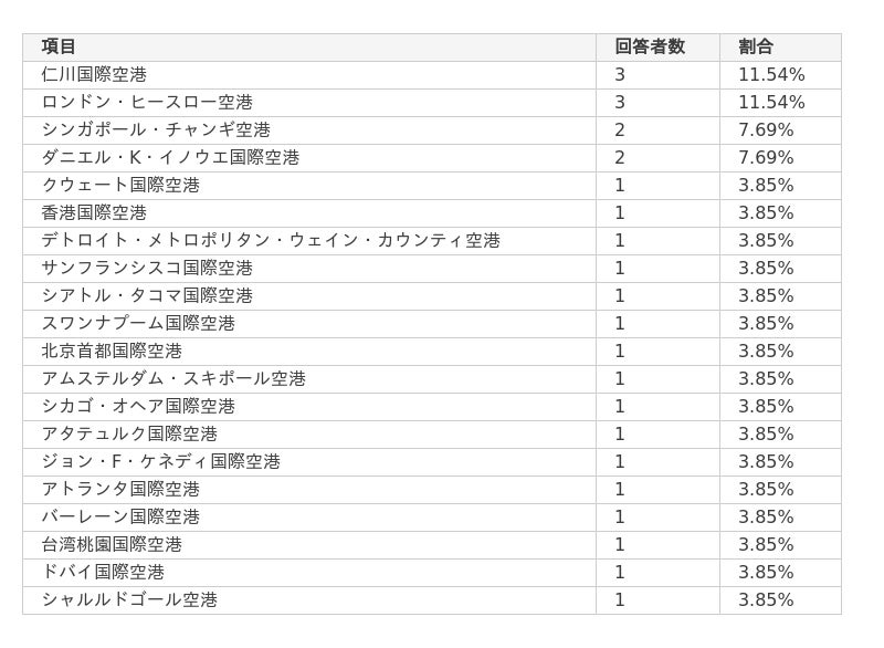 - 国内のおすすめな空港ラウンジとして「羽田空港」を挙げた人が最も多い。一方で、海外のおすすめな空港ラウンジは「仁川国際空港」「ロンドン・ヒースロー空港」を挙げた人が最も多かった。