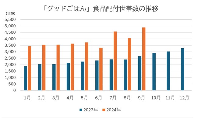 認定NPO法人グッドネーバーズ・ジャパンが運営する「グッドごはん」は、所得が一定額未満で18歳未満の子どもを養育するひとり親家庭等を対象としたフードバンク事業です。予め利用登録をした対象家庭から毎月申し込みを受け付け、無償で食品を配付しています。現在、食品配付を希望する家庭が大幅に増加し、5,000世帯を超える申し込みがきています。本年(2024年)1月と比べ、9月の配付世帯数は4割以上増加しています。また各月の配付世帯数は、前年(2023年)と比べると、各同月より4割から最大8割以上増となっています。
