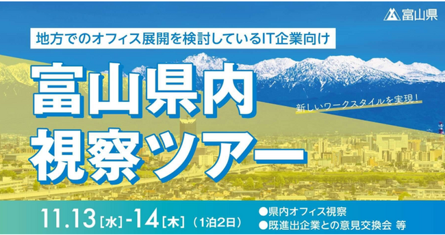 富山県(運営:株式会社Asian Bridge)は、地方への進出に関心を持つ県外のIT企業を対象に富山県内視察ツアーを開催いたします。