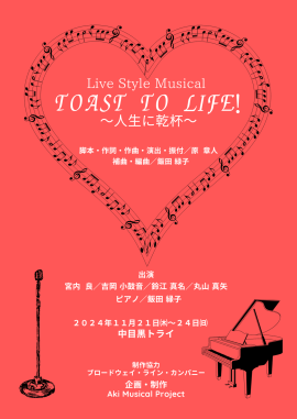 Aki Musical Project(代表:原 章人)主催、 Live Style Musical「TOAST TO LIFE!~人生に乾杯~」が2024年11月21日 (木) 〜 2024年11月24日 (日)に中目黒TRY(東京都目黒区上目黒3-6-5 中目ビル5F)にて上演されます。