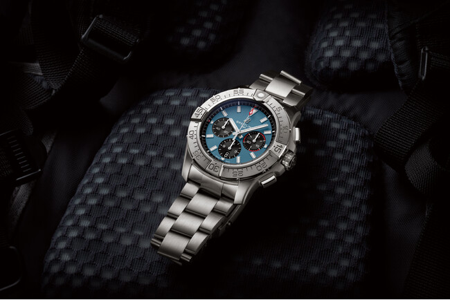 2024年9月、ブライトリングは、新たにスーパーアベンジャーの進化形であるフルチタン製の2つのコアモデルを発表しました。ダイヤルはブラックまたはブルーで、チタン製46mmのケースに同素材を用いた60分回転ベゼルが配されたモデルです。バトンインデックスがダイヤルをすっきりと引き締め、先端が赤いクロノグラフ針を際立たせています。リューズとベゼルに施されたグリップパターンや角型プッシャーは、スムーズな計時操作のためにデザインされています。