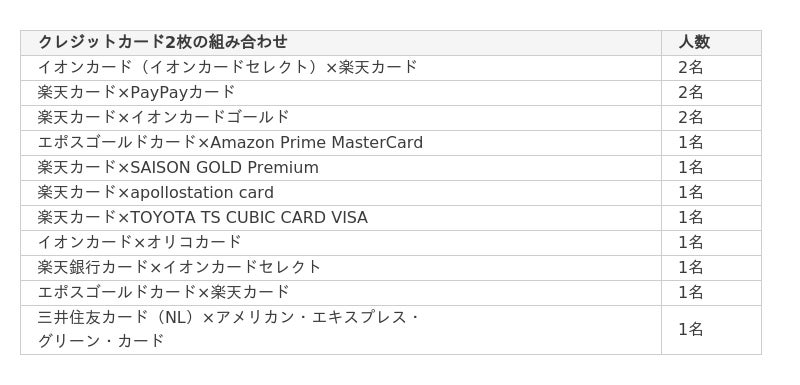 - 実際に2枚持ちしているクレジットカードで複数回答があったのは、「楽天カード×イオンカード」「楽天カード×PayPayカード」「楽天カード×イオンカードゴールド」の3パターンで、いずれも楽天カードがメインカードとして入っていた。