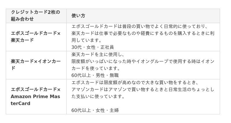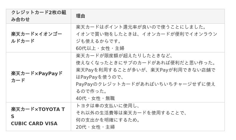 - 2枚のクレジットカードを組み合わせた理由としては、利用先によって使い分けることで多くのポイント還元やお得な特典を享受できたり、支出をはっきりさせたりするためということがわかった。