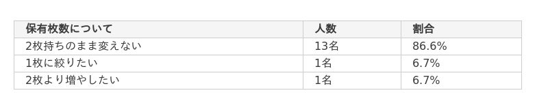 - 今後のクレジットカードの保有枚数に関しては「2枚持ちのまま変えない」が86.6%と最も高く、「1枚に絞りたい」「2枚より増やしたい」といった声はどちらも6.7%と少数にとどまった。