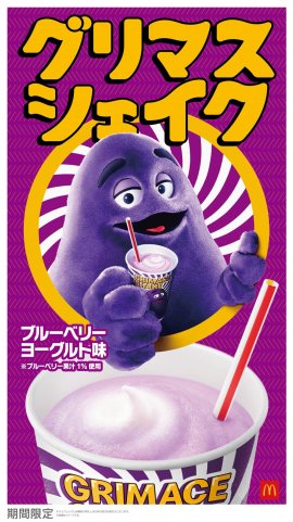 「グリマス」は、1970年代に登場したマックシェイクのキャラクターで、紫色の丸い体が特徴です。おっちょこちょいで不器用な性格で愛されており、好きなものはもちろんマックシェイクです。