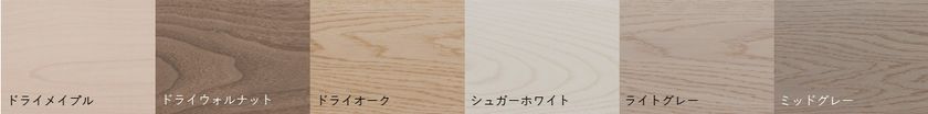乾燥した無垢材が持つ柔らかな色合い・風合いを表現した「ドライオーク」「ドライウォルナット」「ドライメイプル」やホワイト~グレー系カラー等、トレンドのインテリアスタイルとも相性の良い6色をラインナップ。