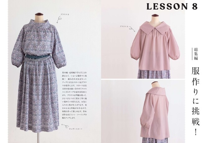 さらに総集編では、海外竜也さんならではのロマンチックテイストの洋服(セットアップ)の作り方を紹介しています。服を作ると言っても、難しいことはありません。スカートは長方形の布を縫い合わせてウエストにゴムテープを通せば出来上がり。ブラウスは付録の型紙を使って、丁寧に縫い進めれば大丈夫。縫い代をつけるなど型紙の基本の扱い方もわかりやすく紹介し、Sサイズから3Lサイズまで5サイズ展開で収載します。布を変えれば雰囲気が変わるので、気軽に何枚も作ってみたくなるはずです。