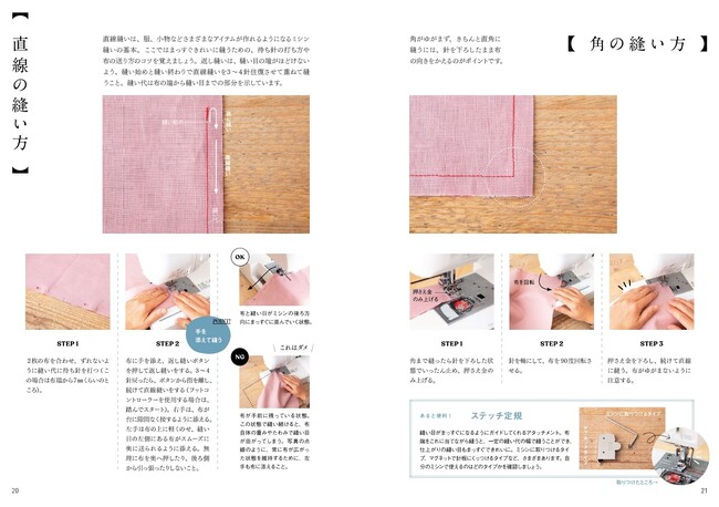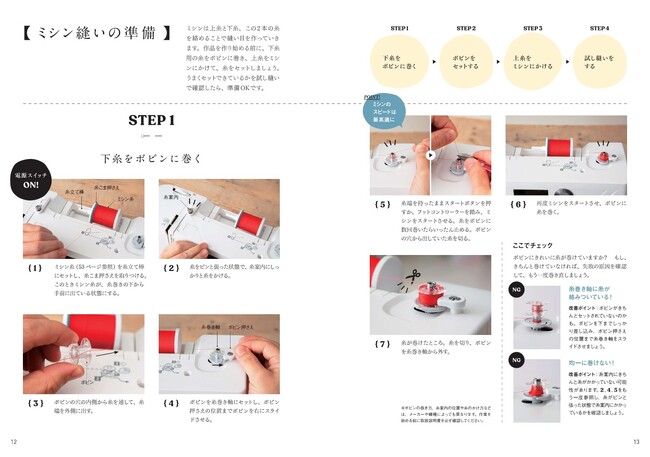 ミシンのトリセツでは機械部分の操作法がメイン、一方ソーイング本ではミシンの基本操作はできることが前提となっています。そこで、ミシンで自由に縫ってみたいと思っても、初歩の扱い方で挫折する人が多いのです。本誌では、豊富なプロセス写真で初歩の初歩から丁寧に解説していきます。