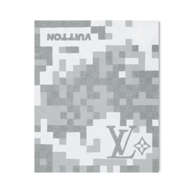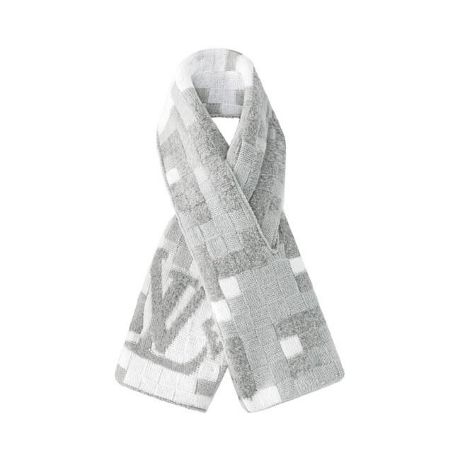 ゲレンデやアフタースキーのパーティーにもぴったりなラグジュアリーな雰囲気の「マフラー・ダモフラージュ」。ウール素材にホワイト & グレーでカモフラージュ柄とダミエ・パターンをピクセル状に表現したプリントをあしらいました。片面のブークレニットは「LV Lovers」シグネチャーで飾り、無地のもう片面には「VUITTON」の文字が彩りを添えます。