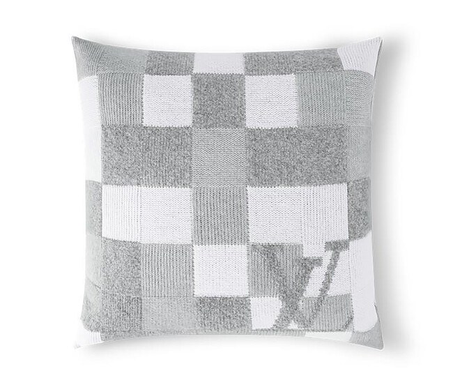 「クッション・ダモフラージュ」は、柔らかなウールのブークレニットに織り上げました。「LV Lovers」シグネチャーと「VUITTON」の文字がスクエアのフォルムに魅力をプラス。飾るだけでホームデコレーションを格上げするアイテムです。