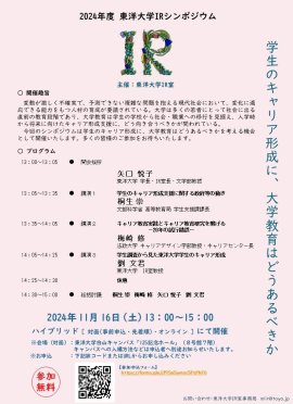 東洋大学(東京都文京区/学長:矢口悦子)IR室は、2024年11月16日(土)に「学生のキャリア形成に、大学教育はどうあるべきか」と題したシンポジウムをハイブリッド(対面・オンライン)にて開催します。変動が激しく不確実で、予測できない複雑な問題を抱える現代社会において、変化に適応できる能力をもつ人材の育成が要請されています。大学教育は学生の学校から社会・職業への移行を見据え、入学時から将来に向けたキャリア形成支援に、どう向き合うべきかが問われています。今回のシンポジウムは学生のキャリア形成に、大学教育はどうあるべきかを考える機会として多角的に議論します。参加費は無料で、申込は本文記載のフォームから受付中。