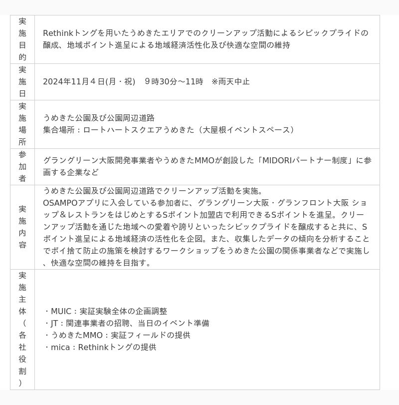 一般社団法人関西イノベーションセンター(理事長 早乙女 実(そうとめ みのる)、以下 当社団)と、日本たばこ産業株式会社(代表取締役社長 寺畑 正道(てらばたけ まさみち)、以下JT)、一般社団法人うめきたMMO(代表理事 大野 郁夫(おおの いくお)、以下うめきたMMO)、株式会社mica(代表取締役 立花 巧樹(たちばな こうき)、以下mica)は、拾ったごみの種類をAIで判別、拾った位置と時間のデータを収集することができるIoTトング(以下Rethinkトング)を用いてうめきた公園エリアでクリーンアップ活動を通じたシビックプライド[1]醸成の実証実験を実施します。