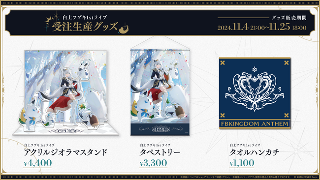 本公演開催に合わせ、本日11月4日(月)より白上フブキ1stソロライブ FBKINGDOM “ANTHEM”ライブグッズが解禁されました。