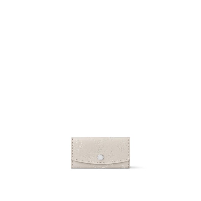 これからの季節にぴったりなフレッシュなホワイトのマヒナ・レザーで仕上げた「ミュルティクレ 4」。整理しやすく洗練された雰囲気が魅力のアイテムです。モノグラム・パターンのパーフォレーションに星座を想わせるシルバーカラーのラミネート加工を施し、同系色のメタルパーツをあしらいました。ライニングを配した内装は、鍵用の4つのフックを備えています。