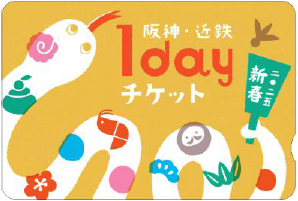 また「阪神・近鉄新春1dayチケット」は、阪神・近鉄両沿線の初詣にご利用いただけるきっぷで、阪神全線(神戸高速線を含む。)と近鉄奈良線(大阪難波駅~近鉄奈良駅間)、生駒ケーブル(鳥居前駅~生駒山上駅間)が1日乗り放題で、大人1,700円とお得なうえ、西宮神社(西宮えびす)、生田神社、湊川神社(楠公さん)、長田神社のうちいずれか1神社の「祈念品」引換券と、春日大社、生駒聖天(宝山寺)、石切劔箭神社、枚岡神社のうちいずれか1社寺の「おみくじ」引換券がセットになっています。