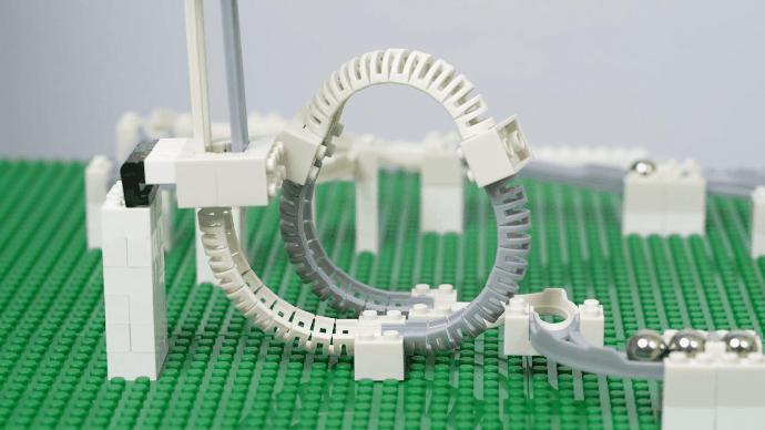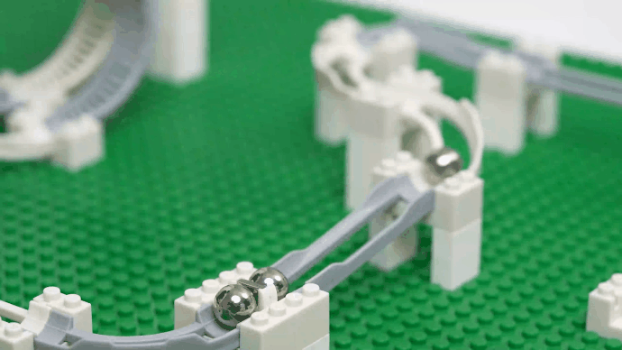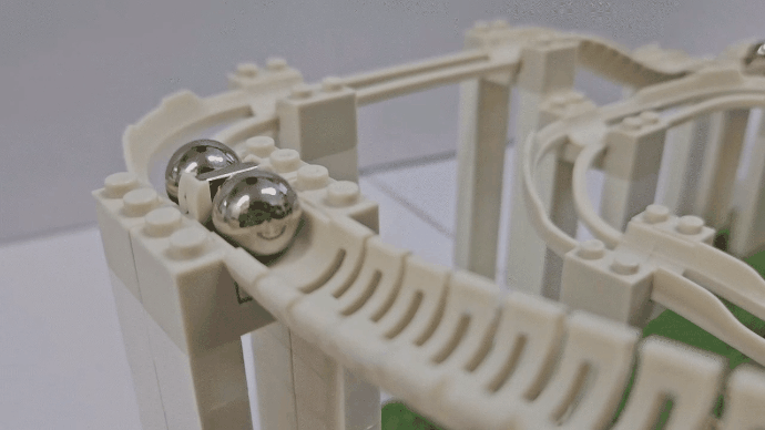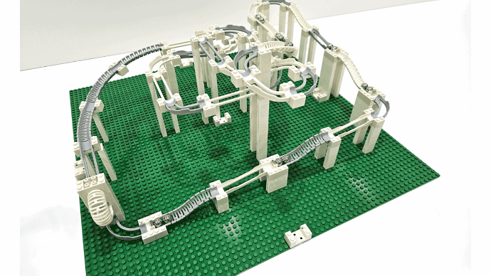 「各社ブロック互換サイズ。縦に組立ててボールが疾走するブロックコースター」