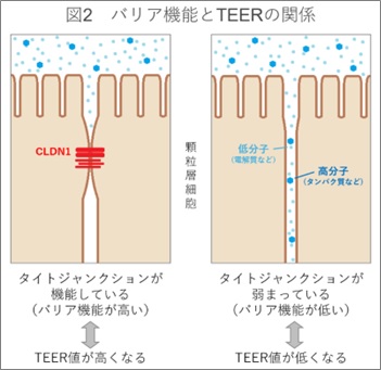 またヒト表皮角化細胞を用いて紫外線によるバリア機能(タイトジャンクション)低下モデルを作成し、本モデルに対する自社ハーブエキスの影響と作用機序を解明しました。バリア機能の評価基準としてはTEER(経上皮電気抵抗値)を測定し判定しました。(図2)