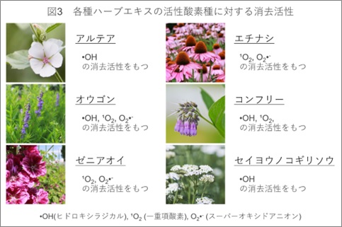 本研究で、ハーブの種類によって消去できる活性酸素の種類や強度が異なることを明らかにしました。(図3)