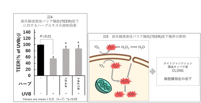 以上のことから、自社農園で栽培したオウゴンとゼニアオイを含む5つのエキスは、紫外線照射によって二次的に産生された活性酸素種ROSを消去することでバリア機能低下を改善する可能性があることが明らかになりました。