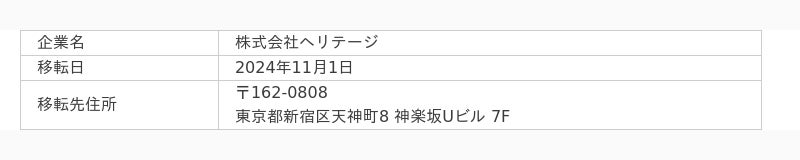 ヘリテージは、2024年11月1日より、本社を下記の住所に移転いたしました。