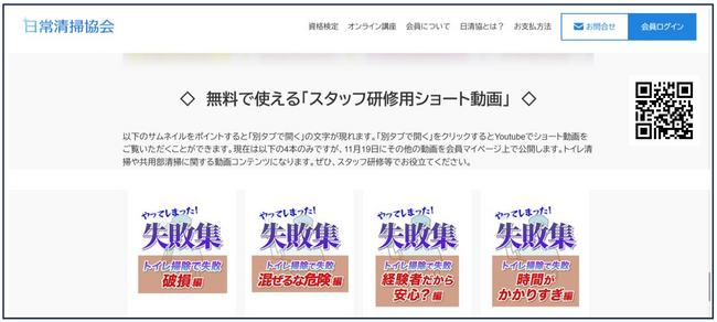 現在、ビルメンテナンス業界は深刻な人手不足の状況にあります。それゆえ、各企業はスタッフ教育・研修に十分な時間を割けずにいます。当協会では、「トイレ清掃の失敗集」という切り口を中心に20本の研修用動画を公開し、各企業や清掃従事者に自由に視聴していただくことで、清掃品質アップ・顧客満足度の向上に寄与したいと考えました。