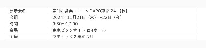 2024年11月21~22日にブティックス株式会社主催で開催される「第1回 営業・マーケDXPO東京’24 【秋】 」にて、11月21日に代表取締役の垣内がセミナーに登壇いたします。
