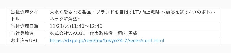 弊社登壇回では、『末永く愛される製品・ブランドを目指すLTV向上戦略 ~顧客を逃す4つのボトルネック解消法~』というテーマで、代表取締役の垣内が登壇いたします。