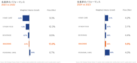 スナックカテゴリー内の各セグメントでは異なる動きが見られ、チルド&フローズンのセグメントが+2.8%で販売数量の伸びを牽引している一方で、キャンディーやチョコレートを含むコンフェクショナリー&スイートのセグメントは価格上昇の影響を最も受けており(+8.3%)、販売数量は減少傾向にある。また、ポテトチップス等のセイボリースナックも価格上昇の影響を大きく受けているが、販売数量はわずかに伸びている(+0.2%)。
