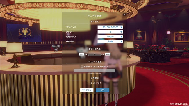 初期チップや長考時間などレギュレーション設定を行い、フレンドや知り合いと一緒に遊ぶことができるプレイモードです。