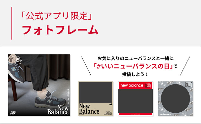 “いいニューバランスの日”を記念して、「公式アプリ限定スペシャルフォトフレーム」をご用意いたしました。お気に入りのニューバランス商品とともに「#いいニューバランスの日」のハッシュタグをつけて、ぜひSNSなどでご投稿ください。