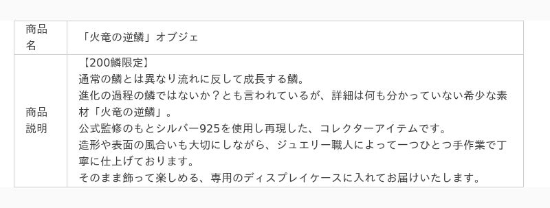 このたびの新作は、「モンスターハンター」に登場する、希少な素材「火竜の逆鱗」を公式監修のもと再現したオブジェです。造形や表面の風合いも大切にしながらジュエリー職人によって一つひとつ手作業で丁寧に仕上げております。