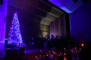 点火式は礼拝形式で行われます。「きよしこのよる」の賛美のあと、聖学院幼稚園年長組による聖書の言葉、点火の合図によって、ステージ上のクリスマスツリーと講堂の外のクリスマスツリーに灯が点けられます。