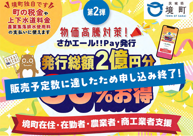 茨城県境町(町長:橋本正裕)では、物価高騰により落ち込んだ消費の回復及び生活の経済支援を図るため、昨年度に引き続き、プレミアム率30%、税金の支払いにも使える電子クーポン「さかエール!!Pay」を発行いたします。